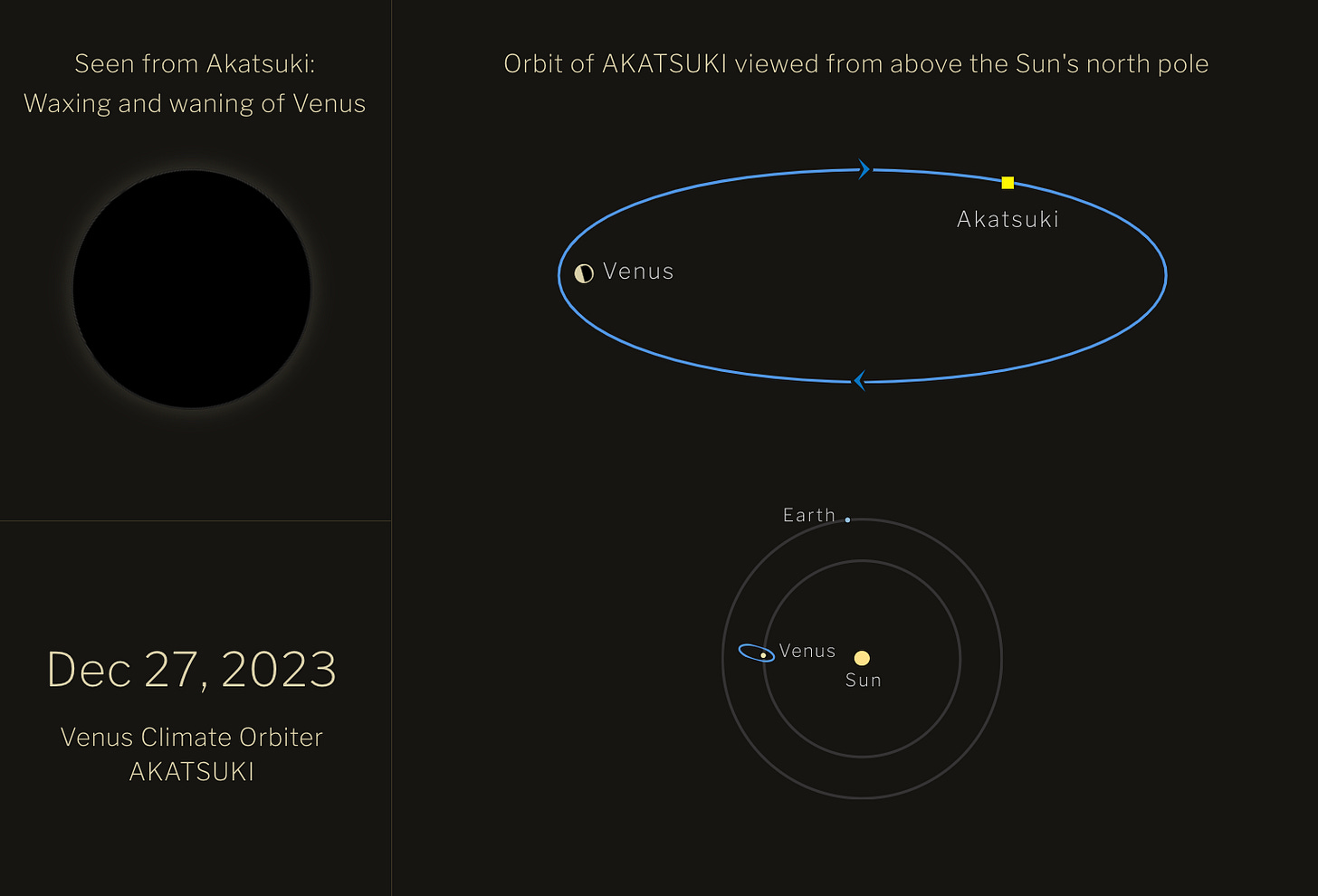 d. Despite initial challenges, Akatsuki's successful study of Venus marks a major accomplishment in planetary exploration, continuously enriching our knowledge of the solar system. For an interactive experience, visit a specific website to view Akatsuki's position and Venus' phases on any given date, like today, December 27, 2023. ( Sorry, I wrote this piece three weeks ago :D)