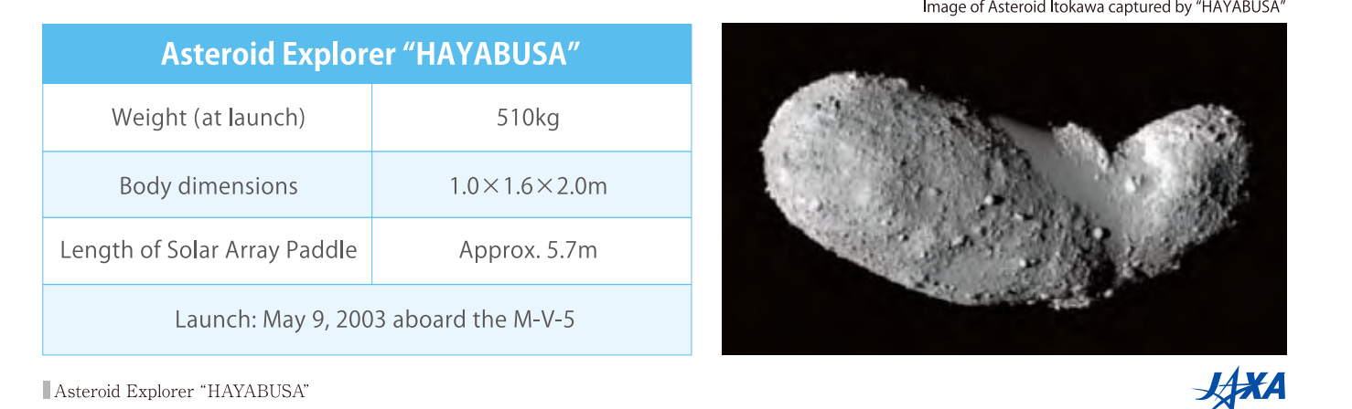 The process of bringing back a piece of an asteroid or another space object is called "Sample Return." Hayabusa was a spacecraft designed to test this kind of mission. It was launched in May 2004 and used Earth's gravity to speed up and reached the asteroid Itokawa in September 2005 after a journey of around 2 billion kilometers. In September and October of that year, "HAYABUSA" studied Itokawa from afar and measured its shape. According to Nasa: Japan's Hayabusa was the first spacecraft to take samples from an asteroid, and was also the first mission to successfully land and take off from an asteroid.