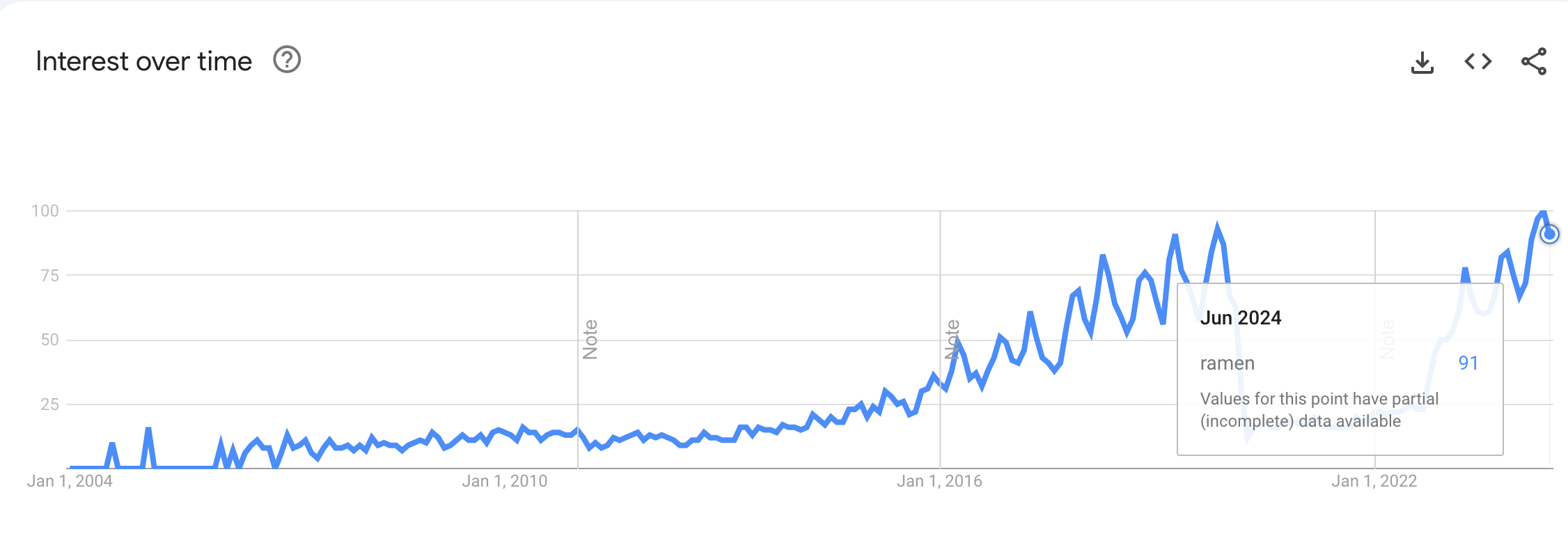 It's interesting to note that also the Google Trends search for "ramen" in Japan shows a steady increase in interest from 2004 to 2024. Check it out here: Google Trends - Ramen in Japan