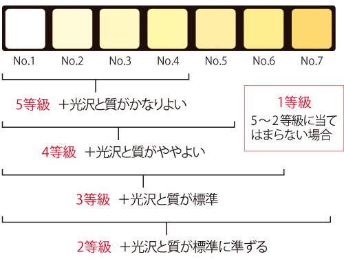 Meat Quality Grade: The number “5” represents the meat quality, rated on four criteria: fat marbling, meat color and luster, meat firmness and texture, and fat quality and color. Each criterion is scored from 1 to 5, and the lowest score determines the overall grade.
